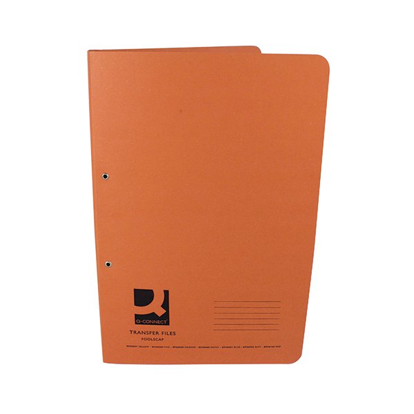 - These Q-Connect Transfer Files are manufactured from 300gsm manilla and fitted with a spring mechanism for easy and quick insertion and removal of papers. Suitable for both A4 and foolscap papers, these files have a capacity of 35mm. The compressor bar keeps documents secure and the 80% recycled cover protects the contents for neat, ordered filing. This pack contains 25 orange files.